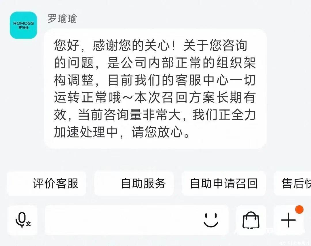 南都湾财社记者也就停工相关问题咨询罗马仕淘宝官方旗舰店客服,客服回应称,“感谢您的关心!关于您咨询的问题,是公司内部正常的组织架构调整,目前我们的客服中心一切运转正常哦~本次召回方案长期有效,当前咨询量非常大,我们正全力加速处理中,请您放心。”